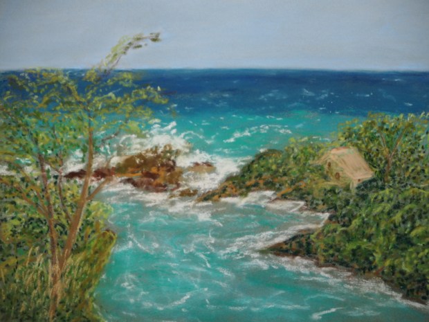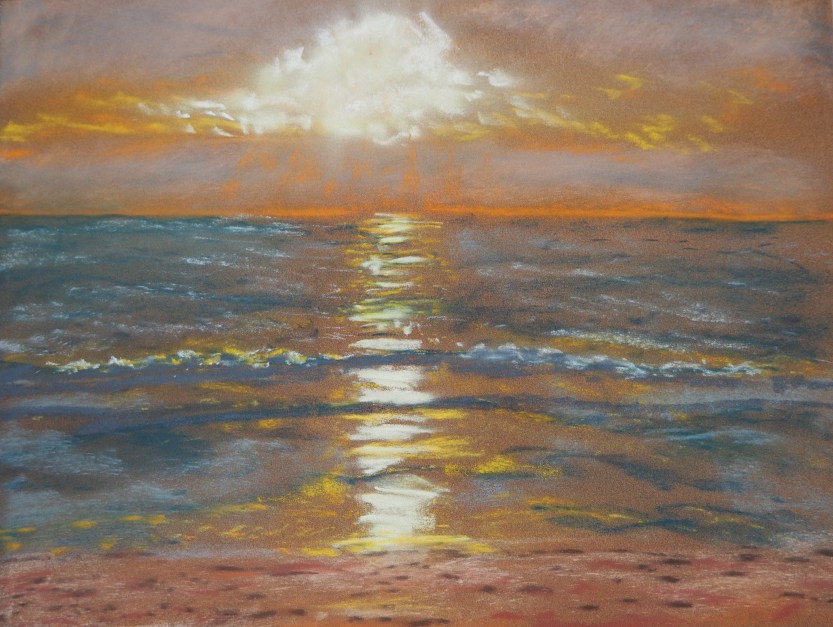 Fragilité du bâtonnet friable, cassable, tenu entre le pouce et l’index en prolongement des doigts, comme un crayon, un stylo ou un pinceau, pour extérioriser la pensée et le désir d’exprimer le monde, les couleurs du monde, l’éclat du monde, la beauté du monde, le premier matin du monde, les fragilités du monde, les petites constructions humaines blotties dans les interstices du monde, l’immense du monde et son mystère insondable, ses sources de lumière et ses zones obscures, la neige éternelle au sommet des montagnes, le surgissement infini des vagues de l’océan, les vastes prairies, les nuages dans le ciel, les moindres variations de la lumière reproduites par la fine poussière crayeuse des bâtonnets de pastel!… A la source de l’enfance, les premières craies du tableau noir, blanches ou de couleur, les doigts qui dessinent des formes ou tracent des lignes d’écriture en tapotant le support rigide, l’éponge qui efface, les frises de lettres tracées au crayon de bois sur les pages du premier cahier, mots initiaux, premiers pas de l’écriture, le moi se découvre agissant sur le monde en écrivant-dessinant, couple indissociable de l’écriture-dessin, magie de la phrase ou de l’image se faisant-défaisant, les mots et les couleurs re-créent le monde, émotion première de l’enfant émerveillé qui ressaisit l’adulte quand ses craies de pastel déposent leurs pigments sur le support granulé qui les accroche… Le dessin ou le texte en devenir suspendu dans le vide d’une page blanche ou d’un support monochrome se couvre peu à peu d’assemblages de mots ou de poussière colorée, un nouveau monde est en gestation, des étoiles, des planètes et des soleils prennent forme, un vent intersidéral fait valser la poussière, du chaos émerge des harmonies de sons ou de couleurs dévoilées par la danse d’un simple bâtonnet tenu entre les doigts…